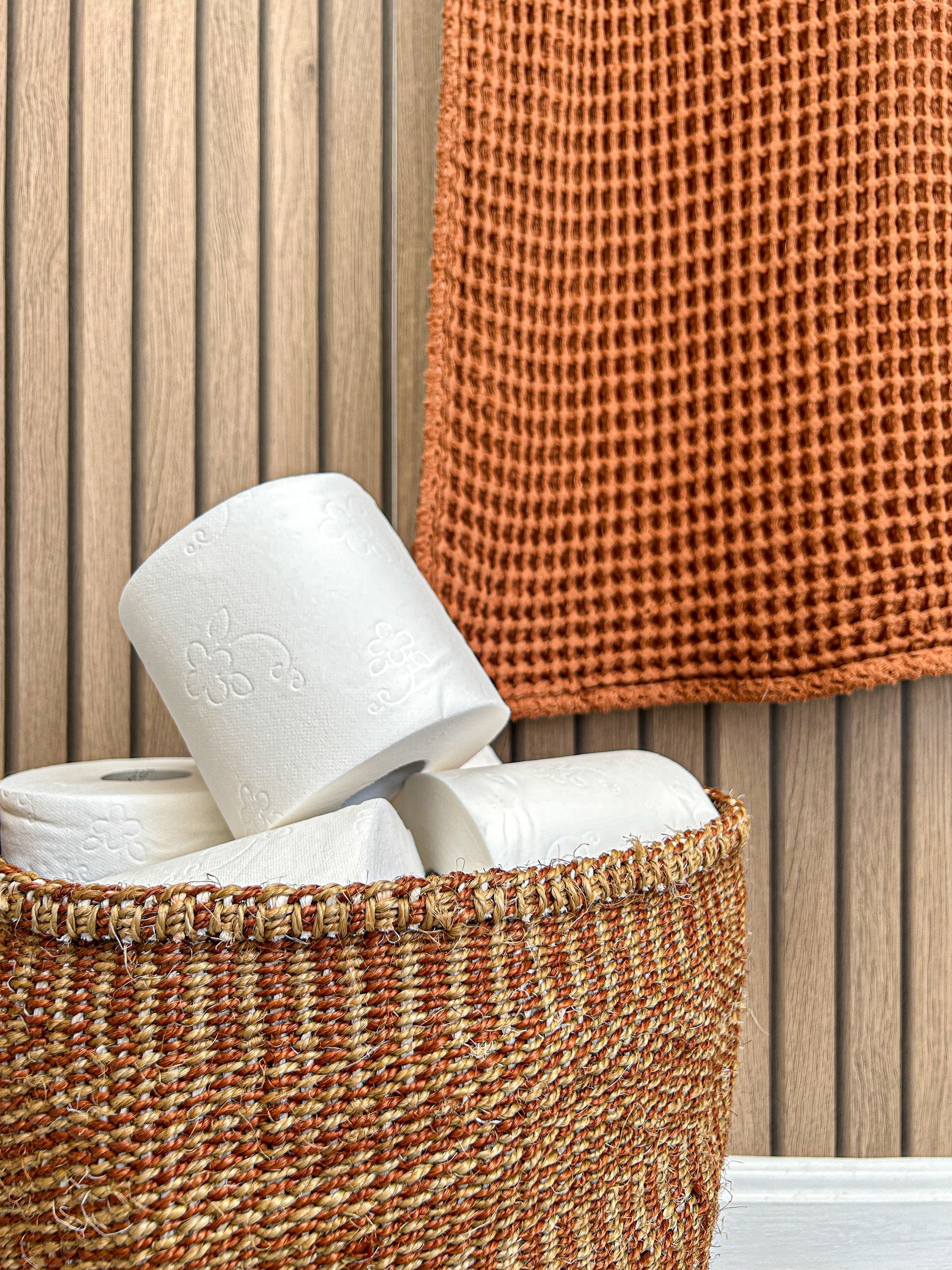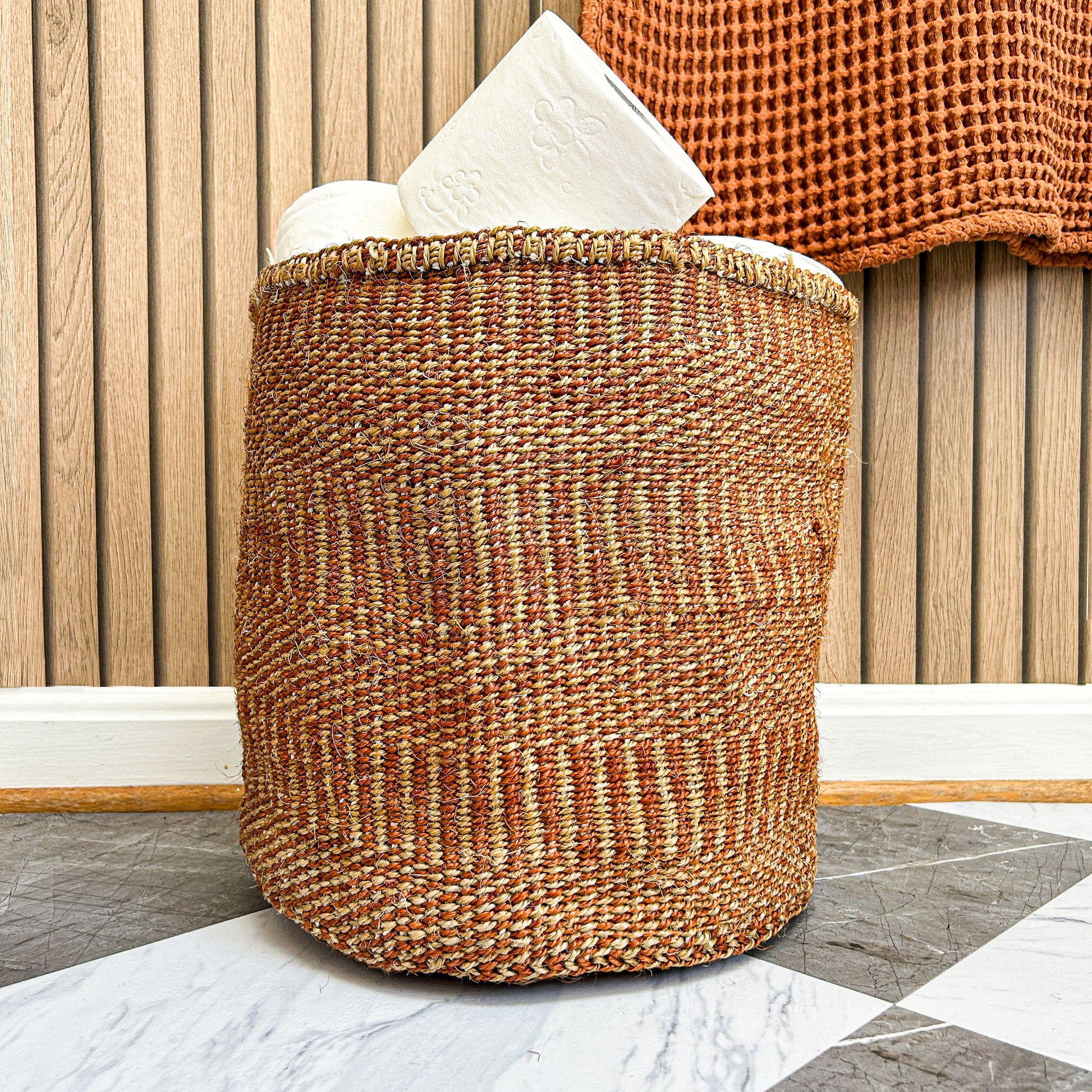 As seen in The African Decor Edit! Made in Uganda from organic raffia grass, this linear design adds character to the mundane task of storage and hiding ever-present knickknacks. This instant ethical upgrade is perfect for bathroom accessories, and can even be used as a waster paper basket by simply adding your own liner or plastic bin, which can fit easily inside.